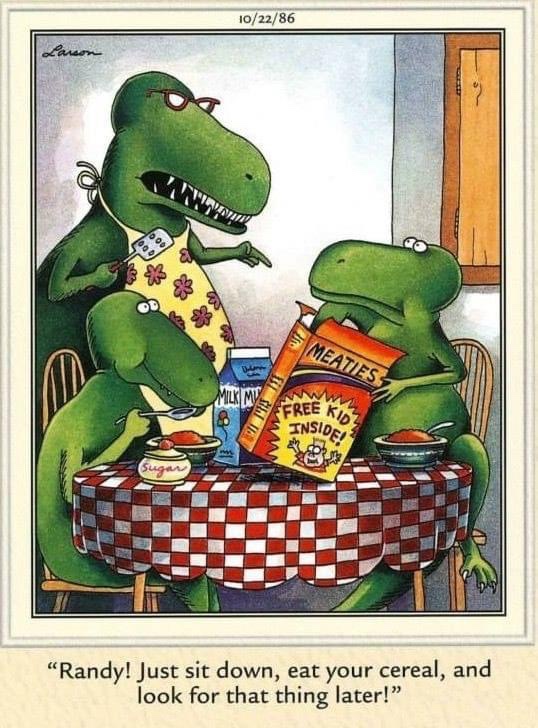 6. Seconde futilité barbante : Préparez-vous, dans quelques jours on va beaucoup jaser dinosaures (à suivre). En attendant, un dessin de Gary Larson (mon idole) :