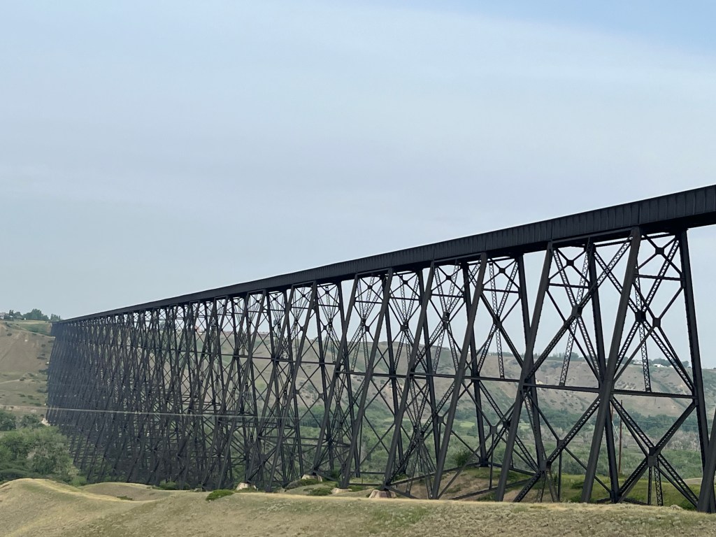 14. Le Viaduc de Lethbridge a été inauguré en 1909. Il y a donc 114 ans qu’y circulent les trains du Canadien Pacifique. Son 1,6 kilomètre lui permet de franchir la vallée de la rivière Oldman et fait de lui le plus long (de même que le plus haut (100 mètres) ) pont ferroviaire en métal au monde. Il est partie intégrante de la Crowsnest Pass Route qui relie Medecine Hat à Hope en banlieue de Vancouver. Depuis belle lurette n’y passe que des trains de marchandises (la route ayant, sur ce corridor, prit le pas sur le transport de passagers). J’ai fais plus de cinq heures de voiture uniquement pour voir ce viaduc. Aucun regret. Il est tout bonnement magnifique. Ne manquait qu’une loco à vapeur et des cowboys.