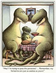 43. Gorgosaurus : My my ! Pas beau beau lui ! Remarquez que … y’en a pas que tu te dis : Don’ bin cute celui-là ! Guili guili Big ? On se fait un donne-moi-un-cinq ? Hon, c’est vrai. T’as les bras trop courts.