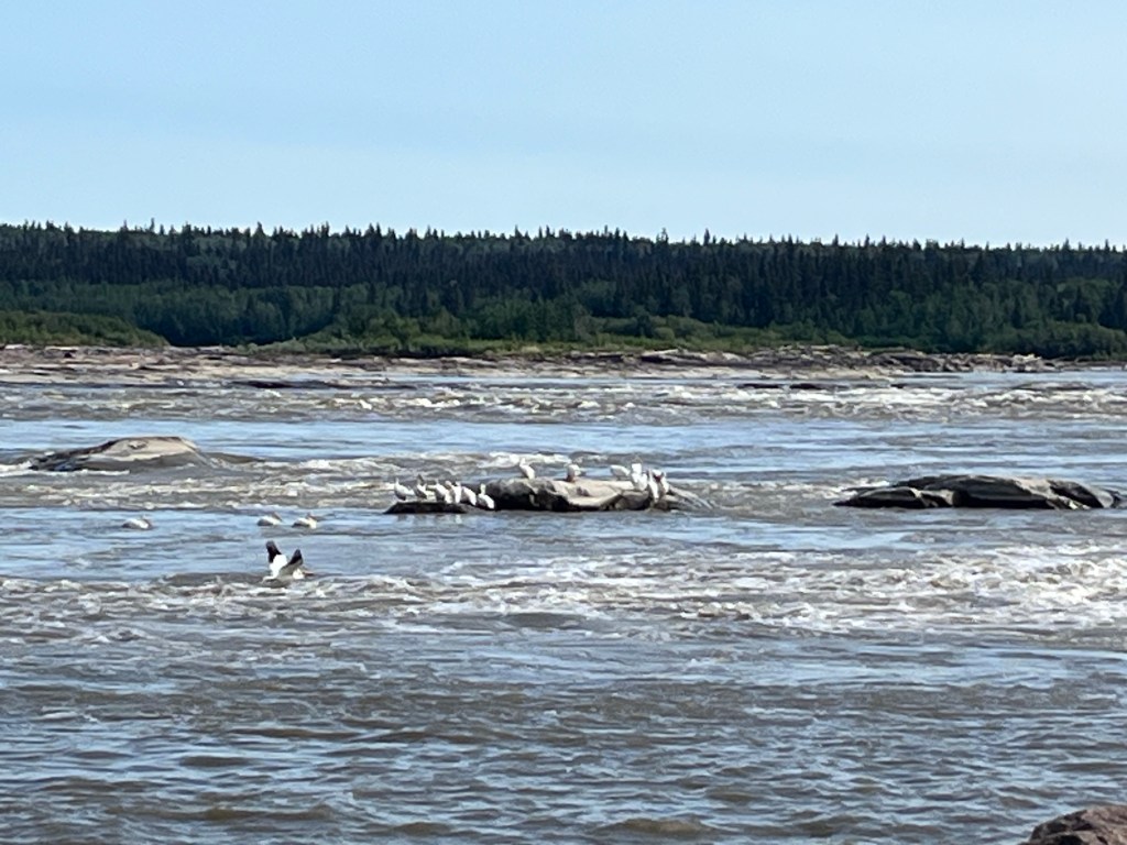 23. Je suis sidéré ! Des pélicans ! Il y a des pélicans sur les îles des rapides de la Slave River à Fort Smith ! Dans les TNO ! Au 60e parallèle ! Je croyais que les pélicans vivaient à Fort-Lauderdale. En Floride. Dans des condos. Bin, pas l’été. Une gang d’entre eux migrent du sud pour venir passer quelques mois ici. Et faire des bébés (des pélicaneaux ?). C’est la seule colonie connue de pélicans qui niche dans des rapides (toutes les autres espèces le font en eaux calmes). … Estomaqué le Bof !