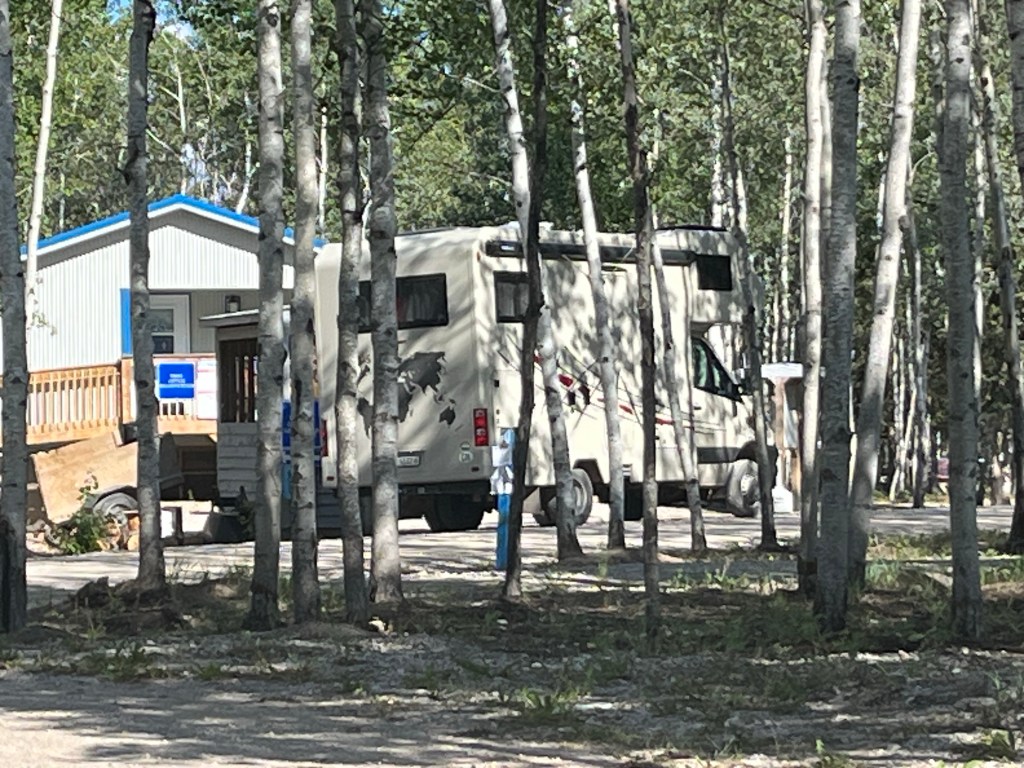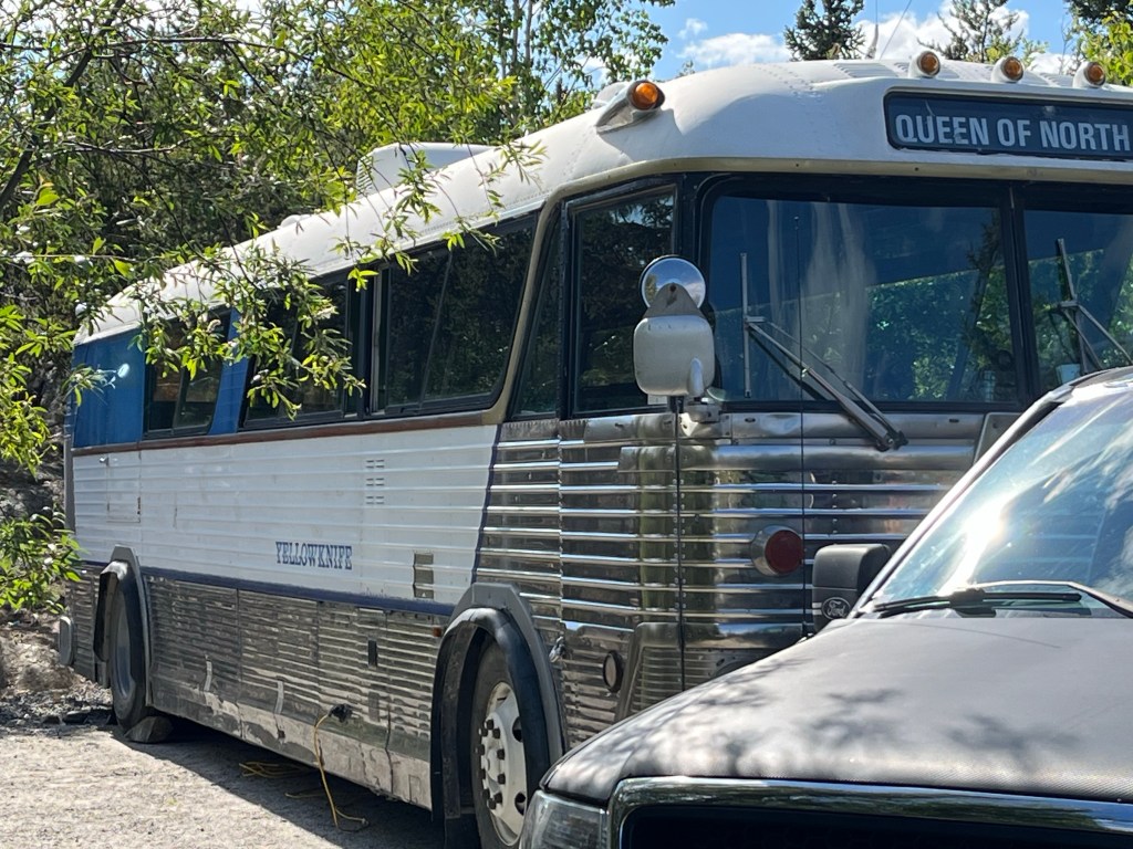 2. Suis pour trois nuits au camping du parc Territorial Fred Henne. Jusqu’à maintenant je n’avais que des bons mots pour les campings des TNO. Mais le Fred Henne, oh boy ! Situé en bordure de la route principale de Yellowknife; et juste en face de l’aéroport ! On va pas là pour le calme et la nature. J’y ai au moins trouvé ce bel autobus converti en véhicule récréatif.
