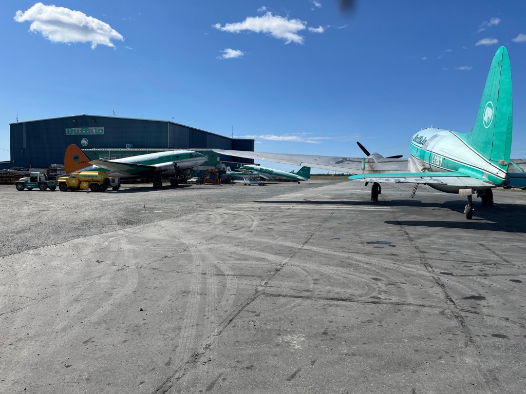 12. Je la mets juste pour me faire plaisir (C’est mon blogue à moi ! Bon). Les deux Curtiss C-46 de Buffalo Air Express. Le C-FAVO vu à Hay River est à droite. Et, en arrière-plan, l’un de leurs quatre Douglas DC-3. N’apparaît pas sur la photo : Un Lockheed L-188 Electra sur le point de décoller.