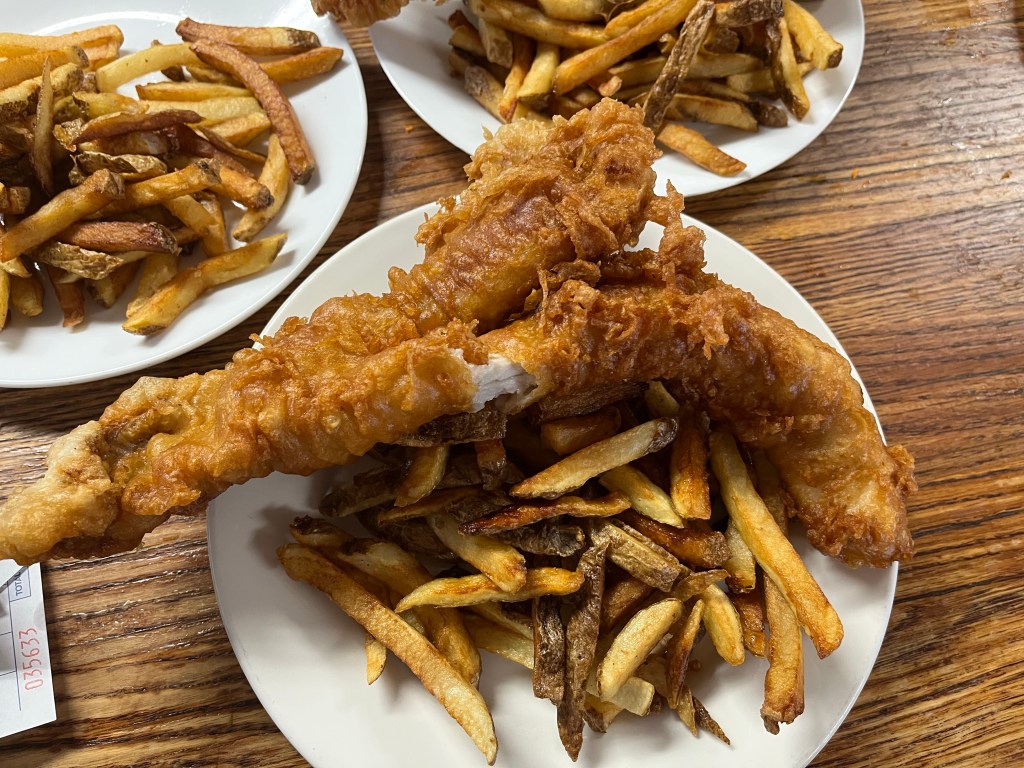 18. Bazwell ! Un fish & chips au Bullock’s … c’est le poisson au complet ! Une portion c’est les deux filets d’un poisson ! Voir si le monde mange ça au complet ? (Peut-être le joueur de football assis à côté de moi !).