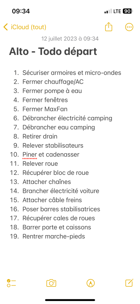 16. Copine me surveille : “Est-ce que tu suis bien ta liste de vérification à chaque fois que tu lèves le camp ?”. La réponse est toujours “Oui” … sauf ce matin … et j’ai oublié un truc. L’étape 12. 🤬. Bon, pas la pire à oublier (j’ai d’autres blocs) mais bon, je n’ai pas suivi la liste et voilà ce que ça donne.