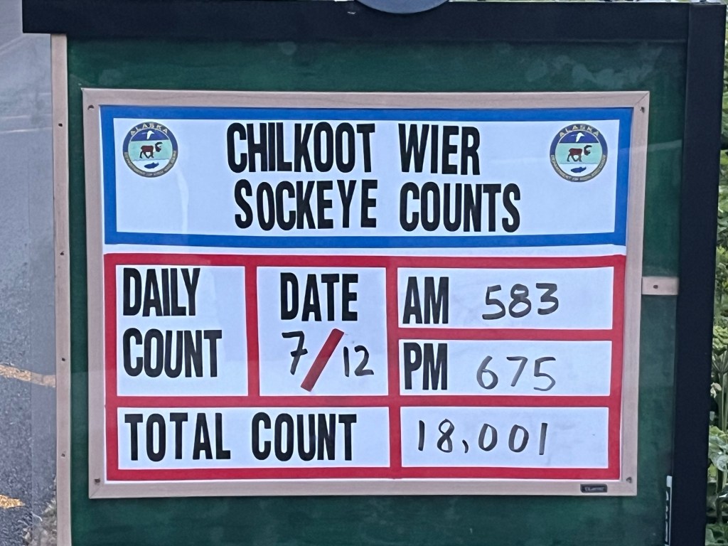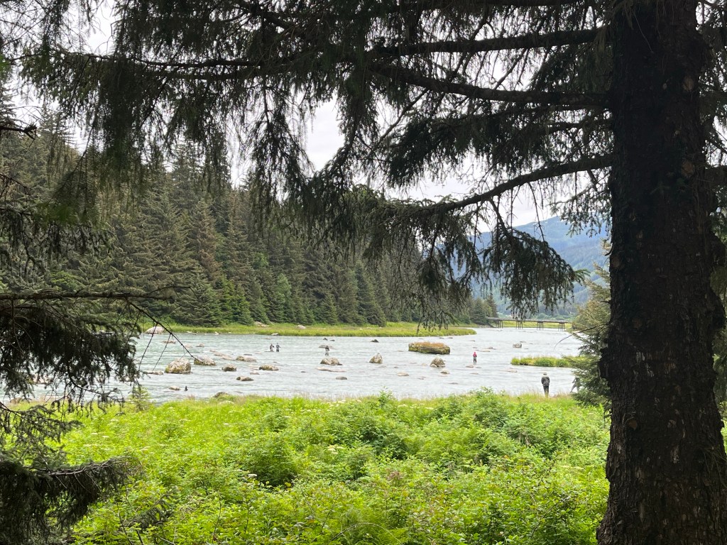 25. Le lac Chilkoot se déverse dans la mer par une courte, mais tumultueuse, rivière de quelques centaines de mètres qui semble ravir les pêcheurs de saumons. En amont des pêcheurs, un dispositif permet de compter les saumons qui remonte le courant. Pour la journée d’hier, 18,001 !!! Essaye de pas pogner de saumons après ça !