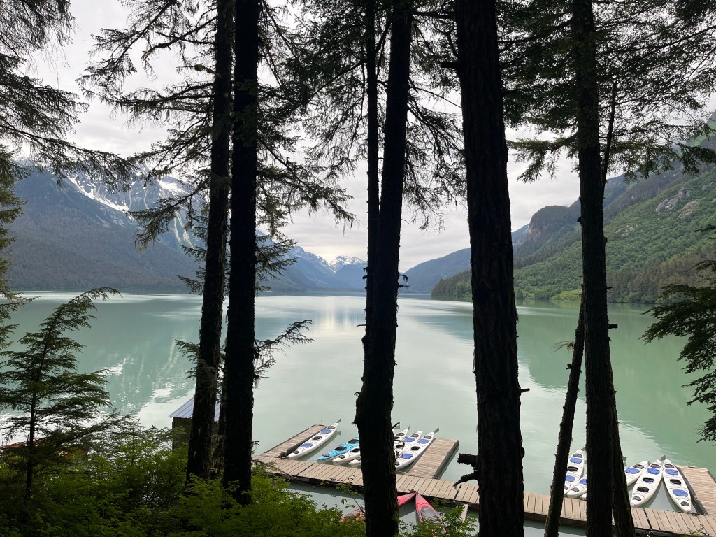 24. Location de kayaks sur le lac Chilkoot. Dans une eau jade, au pied de monts enneigés. Pas pire.
