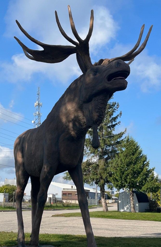 1. L’orignal géant de Dryden. Hauteur : 18 pieds. Pas le plus gros au Canada. Mais le plus vieux (1962). Le plus vieux de quoi ? Des sculptures d’orignaux ? Des emblèmes municipaux sculptés ? Anyway, on est bin fier.
