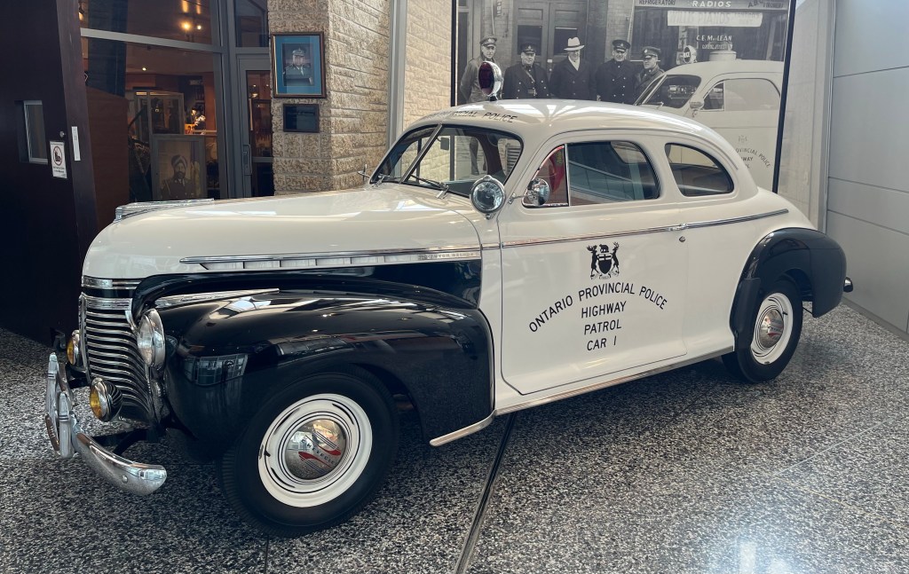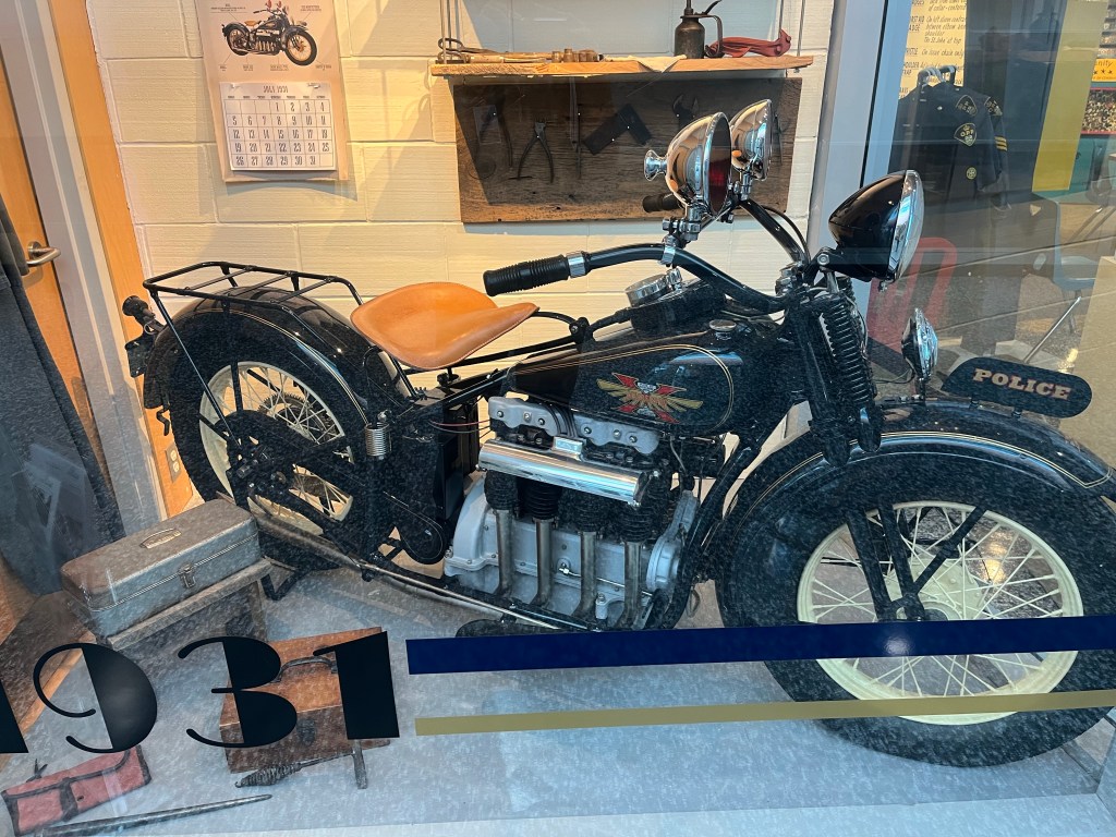 12. Orillia. Musée de la police provinciale de l’Ontario (OPP). Pourquoi visiter ça ? Petit 1 : C’est gratuit et, petit 2, Bof est cheap. Mais surtout, petit 3 : Il y a une Henderson Streamline Special KL 1931 (c’t’une moto; une vra !) (Gueu !). 1 301 cc (😮). Payée 525 $ en 1931; par l’officier Jack Hinchliffe puisque, à l’époque, chaque constable défrayait lui-même le coût de son véhicule … qui était nécessairement une moto. L’OPP n’ayant fait l’acquisition de voitures qu’à partir de 1941 (photo : Chevrolet Master Deluxe Coupe 1941). Notez qu’il y a un phare rouge sur le toit mais pas de sirène. Par contre, le policier était équipé … d’un sifflet (!).